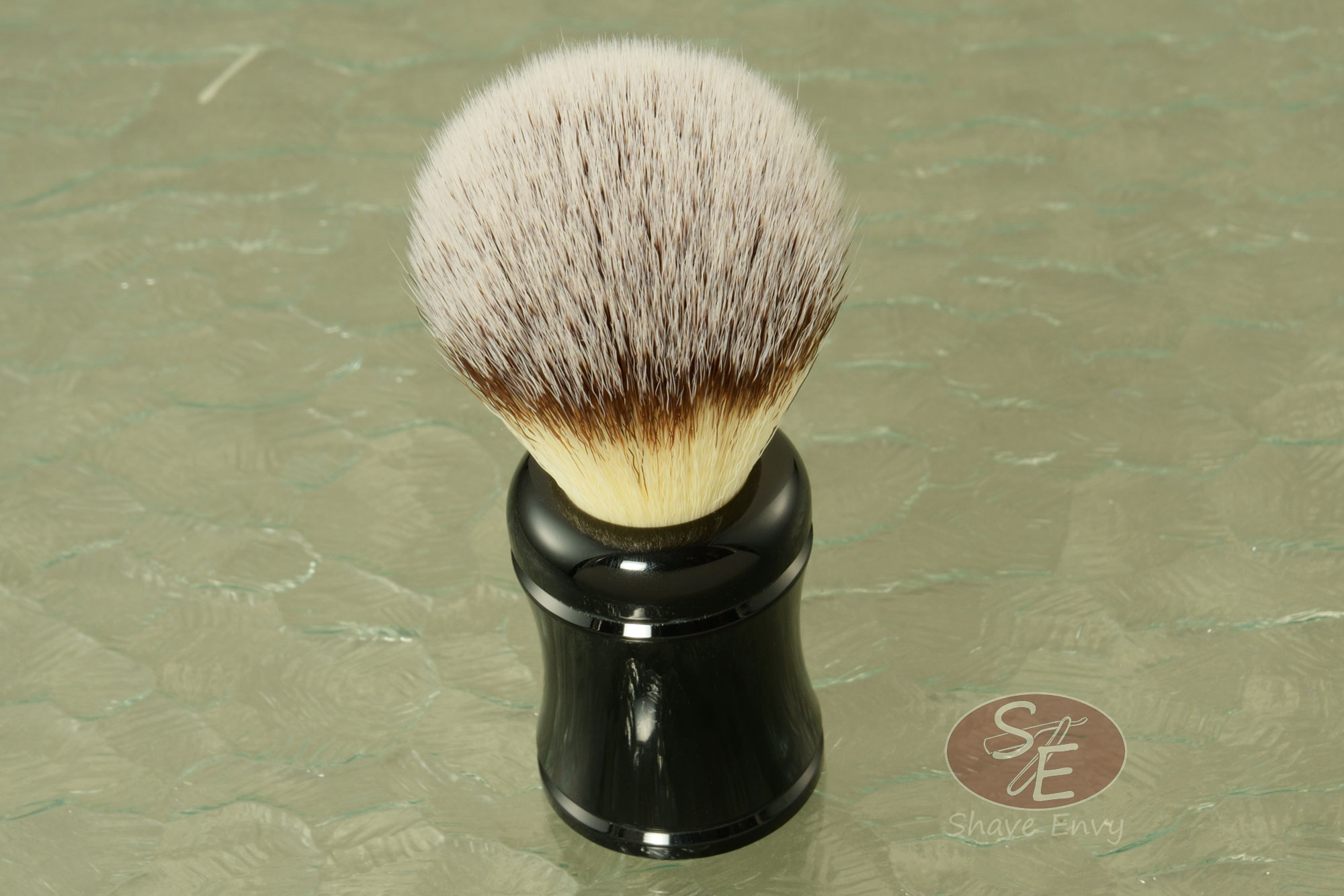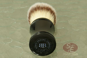 John Leitch crafted this shaving brush by turning a rod of black acrylic resin, 1-1/2 inches in diameter, with a height of 2 inches. The acrylic was brought to a high polish and laser marked with a logo on the bottom. The handle is lightweight, easy to clean, and comfortable to hold.