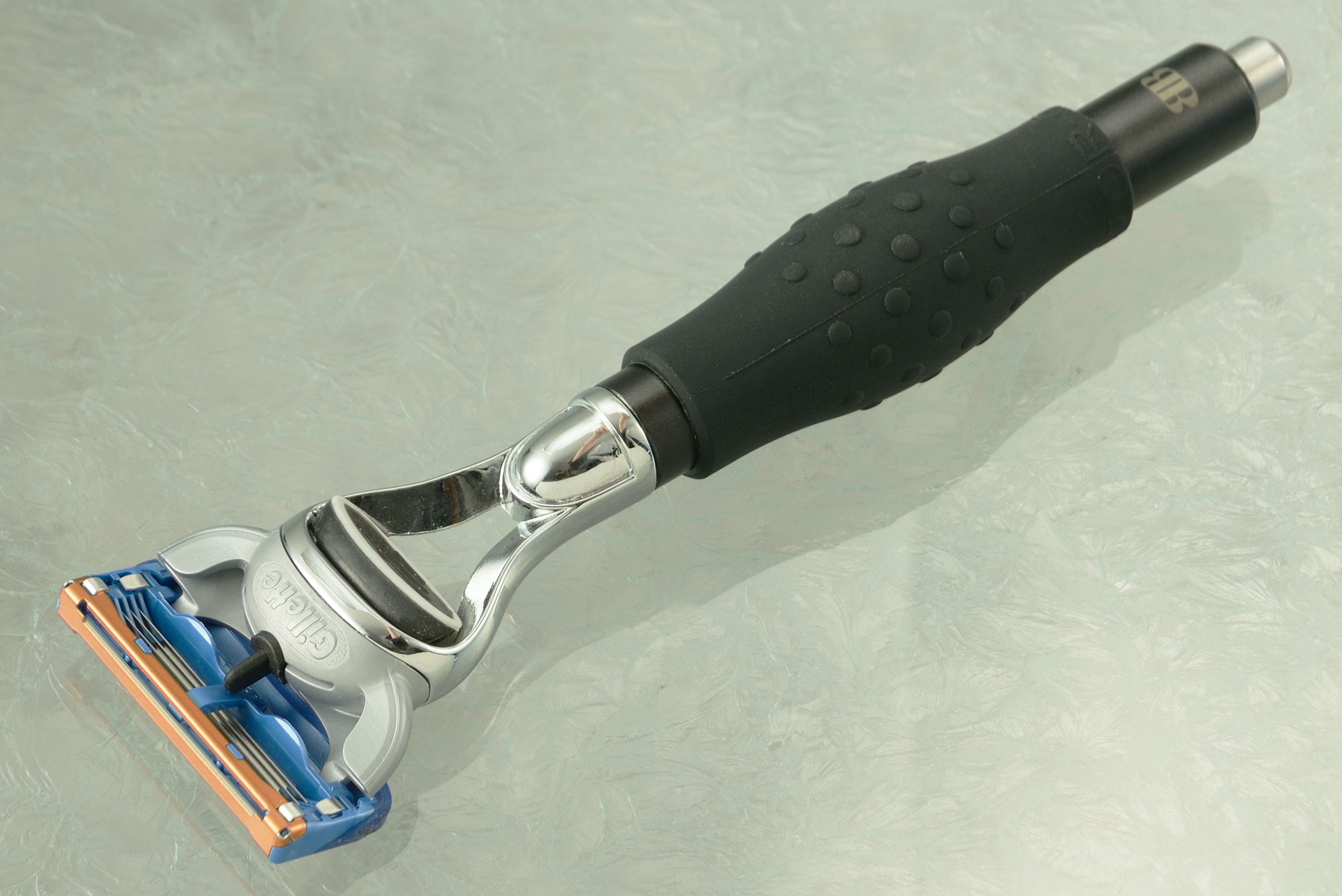 Handle: Textured rubber Razor-Grip over black anodized aluminum