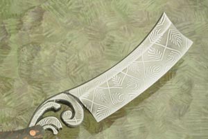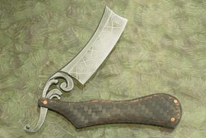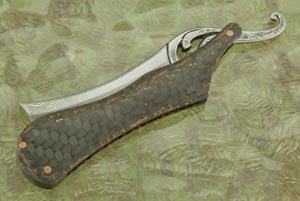 The blade is made from mosaic damascus forged from carbon steels by Texas bladesmith Bill Poor. Poor's mosaic damascus is extremely detailed and shows tremendous control at the forge. The carbon steel blade will have exceptional edge holding and is extremely sharp. This 5/8" razor is meticulously hand carved. The quarter hollow blade was hollow ground on a 4 inch wheel for easy maintenance and sharpening.