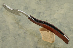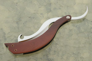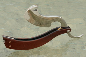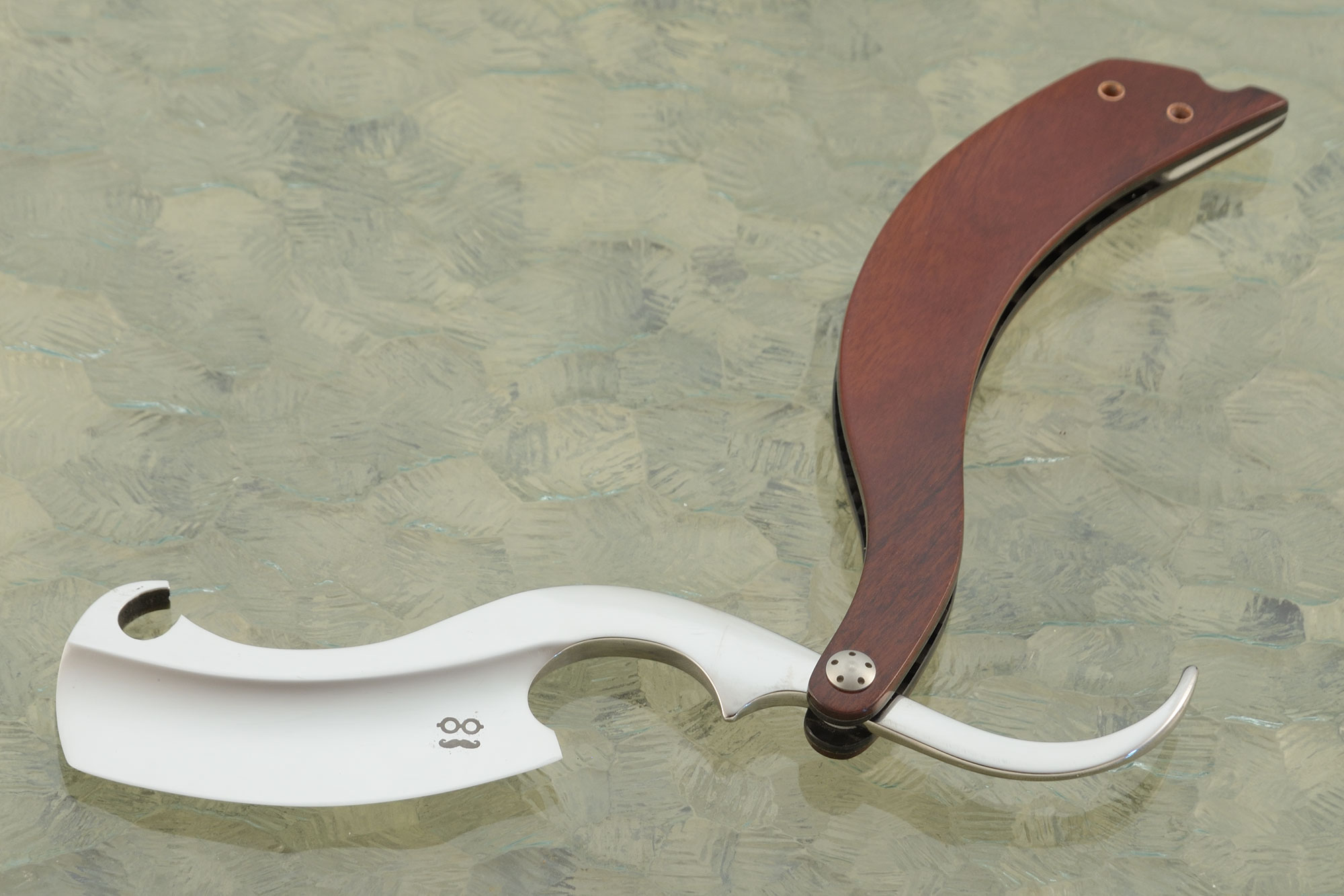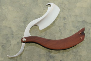 The 7/8 premium RWL-34 stainless steel blade features a full hollow grind. RWL-34 is a premium powder metallurgy cutlery steel manufactured by ERASTEEL in Söderfors, Sweden. Because it is manufactured from rapidly solidified powders, the microstructure of the steel is much more uniform. This gives the steel much higher strength and durability while maintaining very high wear resistance. The smiley shape makes shaving around delicate areas easier to control. The tail is hand carved and pierced.