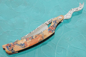 The handle is stabilized South African mopane wood (Colophospermum mopane). Carbon fiber liners provide strength and durability. The scales are carved and painted, with detailed images of Japanese-inspired koi.