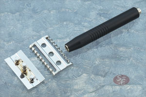 The head on this razor is the R-41 open comb made in Germany by the Hans-Juergen Muehle GmbH & Co. KG. This style of head was developed specially for practiced wet shavers. Due to its construction principle, which features a special blade angle, the model enables a vigorous and direct shaving technique that is ideal for thicker hair. The internal thread of the handle will also accommodate many other brands of safety razor heads made in Europe.