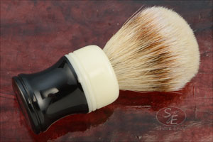 John Leitch crafted this shaving brush, hand turning it from black and ivory Plexiglas. The handle has a nice heft, is easy to clean, and comfortable to hold.
