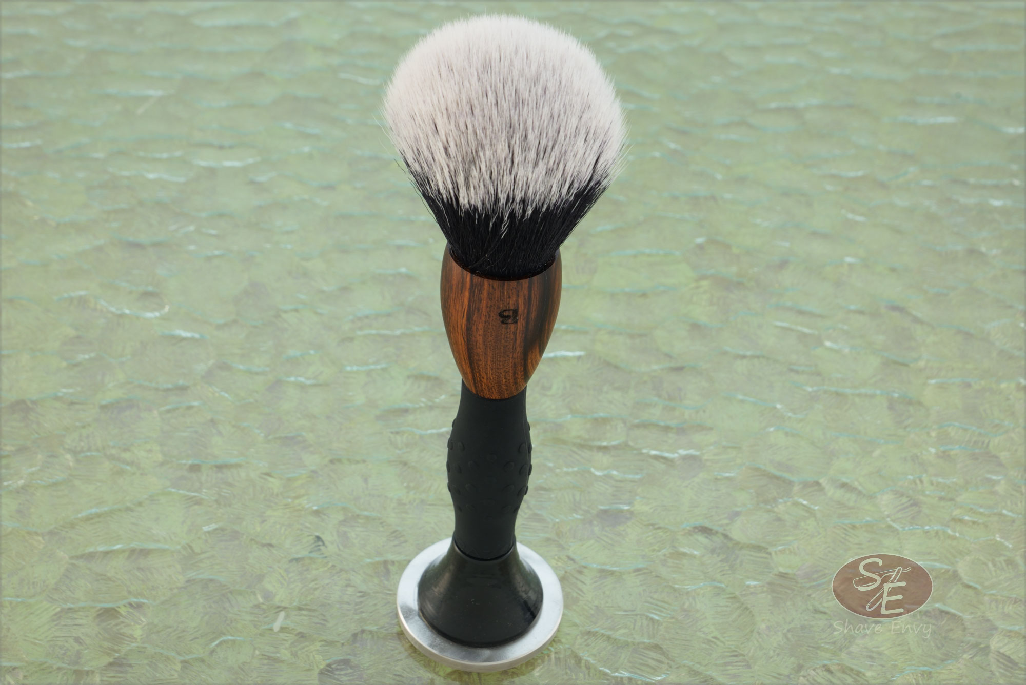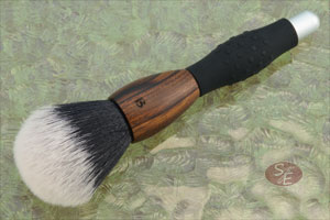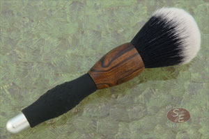 John Leitch crafted this shaving brush, combining an Arizona desert ironwood base with a silicone rubber non-slip comfort grip. The handle has a nice heft, is easy to clean, and comfortable to hold.