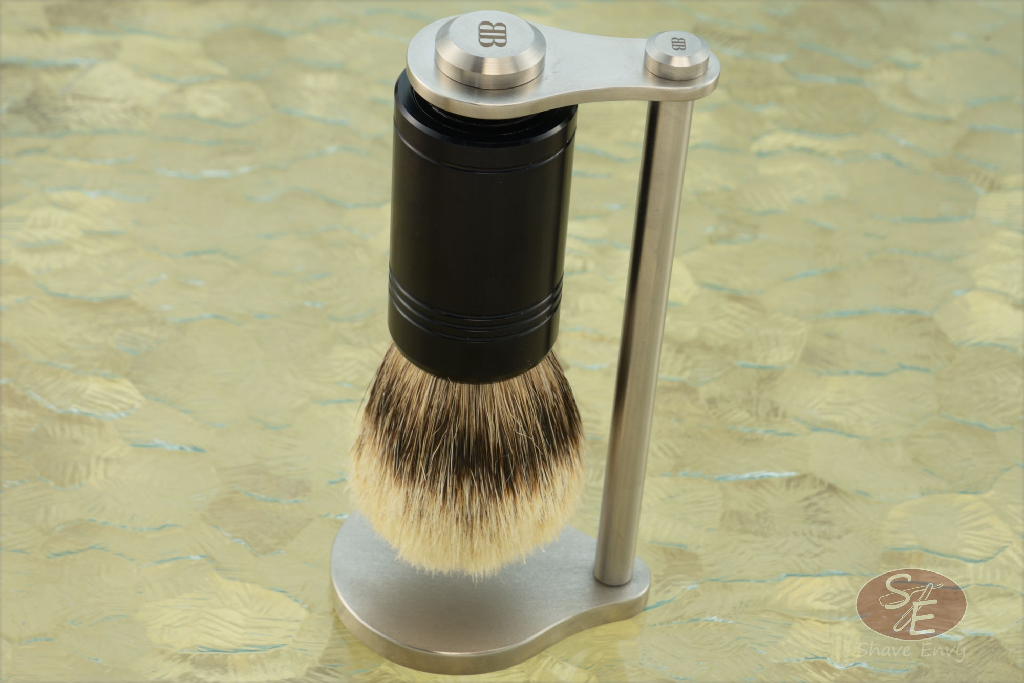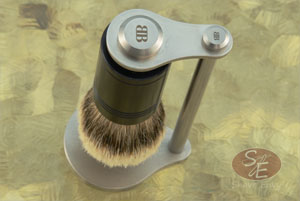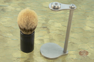 The bristles are silvertip badger, which is the very highest quality specification for badger bristle. This brush can be used on a daily basis and will likely endure for thirty or more years. Like other brushes, for longevity it should be stored inverted. To help with this, John imbedded magnets in the stand and the back of the handle. This allows it to hang suspended from the stand. The stand is made from satin finished stainless steel and has John's logo at the top.