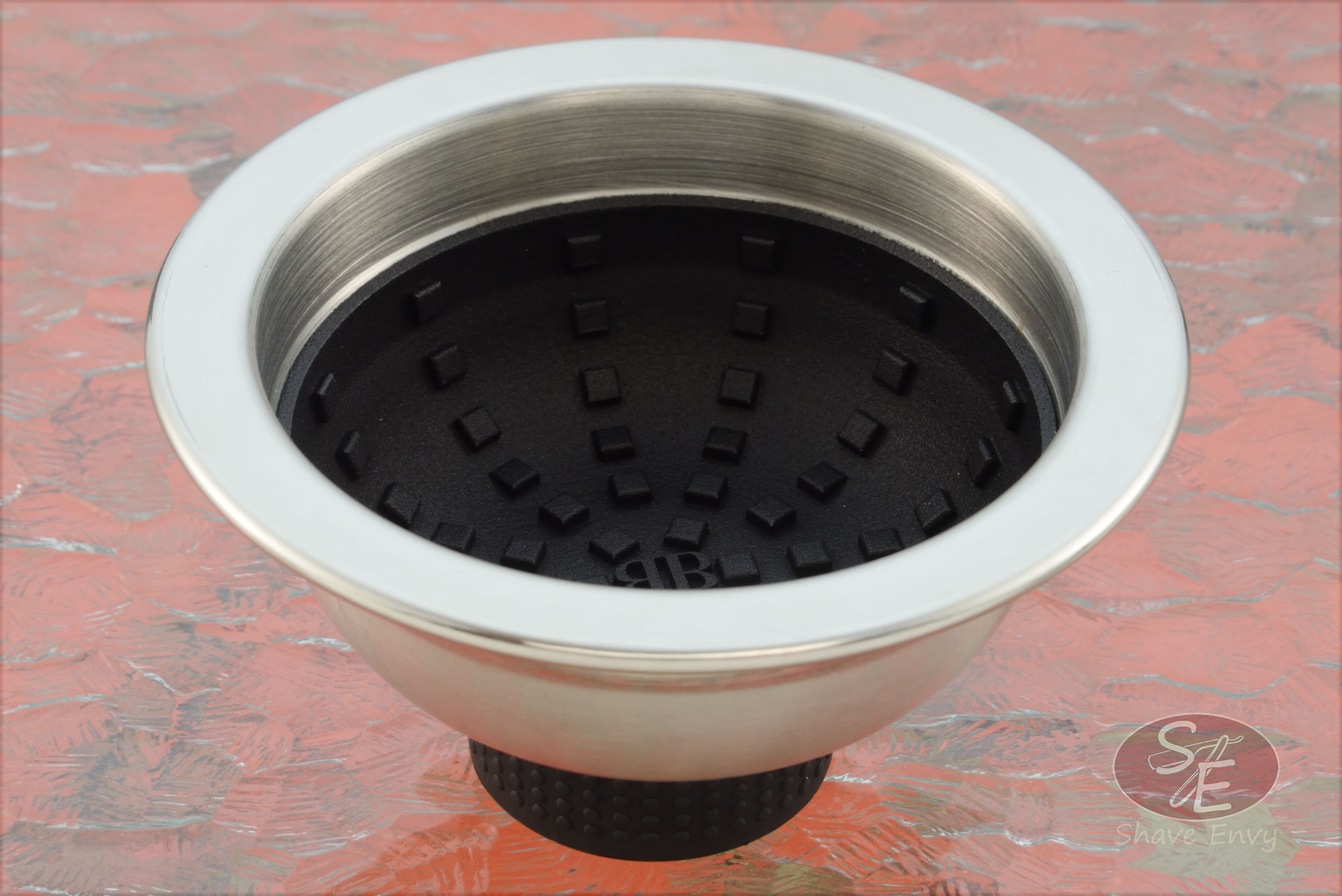 Description: This lather-generating shaving bowl is a recent design to join the Byron Shaving Company lather bowl group. The new inner layer lather-generating grid is produced locally in Tucson, Arizona by a 3D printing company. The precision-fit liner leaves almost no space between it and the stainless steel bowl. Leitch's signature silicone rubber pedestal base provides a comfortable grip to "churn" your soap into lather.