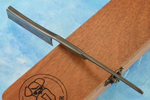 This exquisite Japanese-style straight razor was custom built by Stuart. In Japan, it is called a kamisori. The san mai blade features a high performance Aogami Super steel core. Hitachi Aogami Super has some of the best edge holding of any carbon steel used today. Because this razor is forged from carbon steels, we recommend camellia oil to protect it from oxidation. The straight edge culminates in a French point. The quarter hollow blade is 7/8.