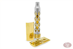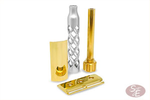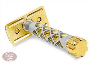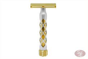 Description: Entirely designed and developed in Italy, the Valynor safety razor is the latest creation by The Goodfellas’ Smile. This extraordinary razor combines elegance and quality in detail, with a fantasy-inspired design. The handle is made from silver anodized aluminum, while the head and the base are in machine-polished brass. (Note that while brass is resistant to corrosion, it can tarnish unless cleaned periodically with metal polish).