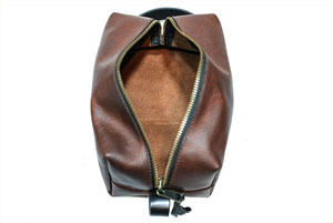 The dopp kit is made from 4oz full grain oil tanned leather with an 8oz full grain bridle leather strap.