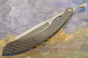 The handle is carbon fiber. Blue G-10 liners add a pop of color contrast. African tribal ShweShwe adds visual interest to the interior of the handle. ShweShwe is a printed dyed cotton fabric that is popular in South Africa, made using a variety of colors and intricate geometric patterns. The wedge is also made from carbon fiber and blue G-10. The large handle is comfortable and provides an excellent sense of balance while the razor is open.