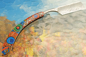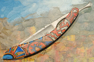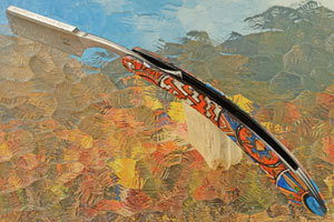 The handle is hand painted G-10 set on carbon fiber liners. The painted scales feature a beautiful abstract scene with colorful geometric shapes. Each side is unique. The wedge is made from carbon fiber and white G-10. The large handle is comfortable and provides an excellent sense of balance while the razor is open.