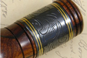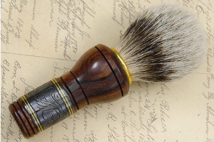 John Leitch made this shaving brush by first turning the handle from cocobolo wood. A central band of stainless steel has been gun blued and engraved. A 14kt gold border adds tremendous contrast.
