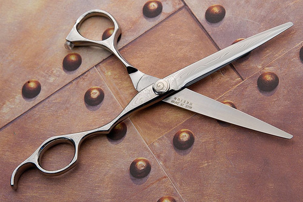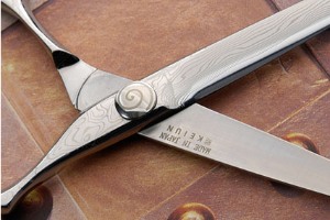 The damascus steel used in these scissors is forged from two stainless steel alloys, repeatedly folded and tempered. The result of this forging method is an extremely pure metal structure that combines strength with flexibility, a unique dampening property (which transmits the cutting feel), and a stunning water flow pattern, typical of damascus. Hairdressers have praised these scissors for ergonomics that make the scissors an extension of the hand.