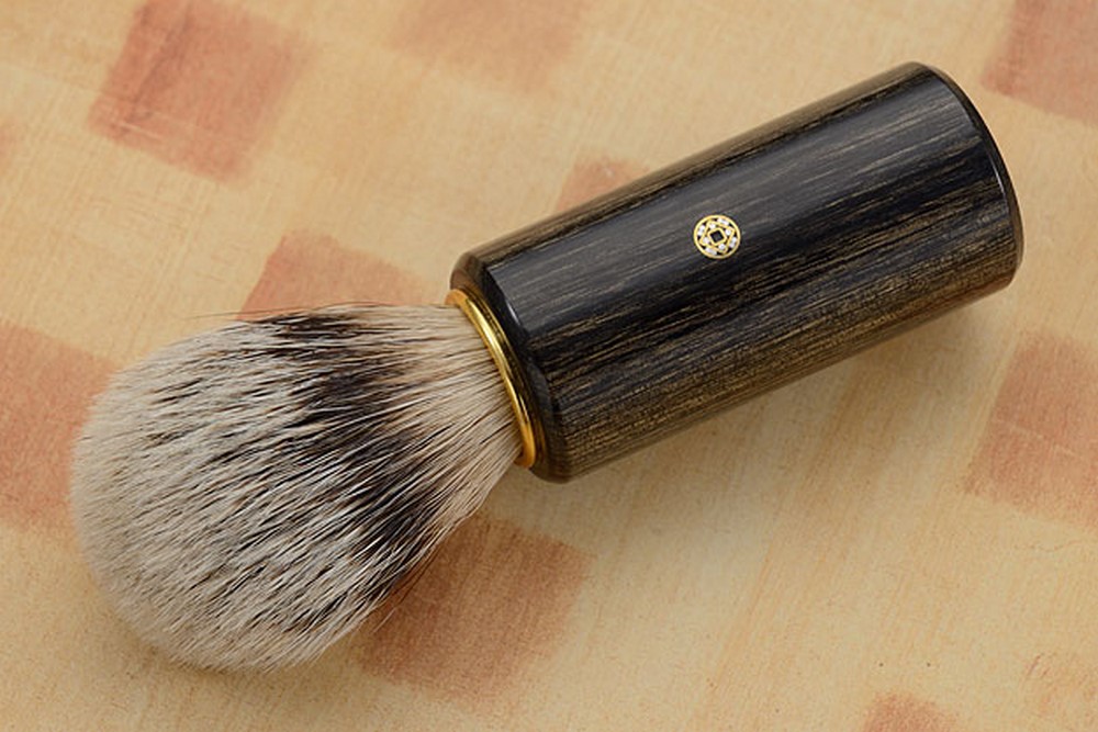 John Leitch began this handmade shaving brush by forming the handle from black toned Dymondwood. A central mosaic pin adds contrast.