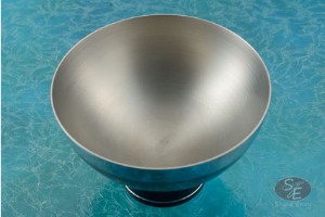 John Leitch made this shave bowl combining a stainless steel bowl with a hand turned aluminum base. The outside of the bowl is etched, providing both beauty and a great tactile feel. The interior is satin finished. The four inch diameter bowl is a perfect size to cup in your palm. The black anodized aluminum base has a cocobolo (Dalbergia retusa) inlay on the bottom.